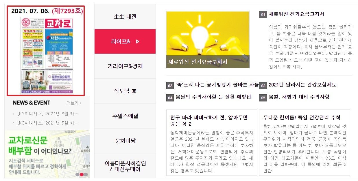 좌측에 보시면 오늘 날짜로 교차로 신문 모양의 그림이 있는 것을 볼 수 있습니다. 클릭해서 들어가보면 아래와 같이 실제 교차로 신문을 보는것 같은 화면을 볼 수 있어요.